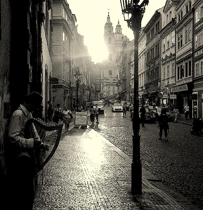 Arrampicarsi di sera sul colle a ovest della Moldava, dove il Castello domina la vista, è un’impresa che ha un che di fiabesco. Ma si fa presto a capire che la favola in questione è nera. Le mura imponenti, gli spigoli della Cattedrale, i riflessi delle vetrate colorate e oro sanno di un’epoca fuori dal tempo, che è antica ma è sempre presente perché immaginaria. Quello è un Tempo estraneo, un tempo che è altrove, di cui vagheggiare. Volatile come il fumo profumato che sale da un pentolone lungo la strada, e intorno c’è musica. Viene dall’isola Kampa, al centro della Moldava, dove un canale affollato di luci in festa stona col nome che porta, Canale del Diavolo. Ci si aspetta di veder comparire streghe e maghi con chissà che pozioni. Invece a ribollire in quei pentoloni di ghisa sono solo patate, mischiate con la panna acida e le cipolle in purea per accompagnare il prosciutto roseo e colante di grasso che gira sul fuoco.