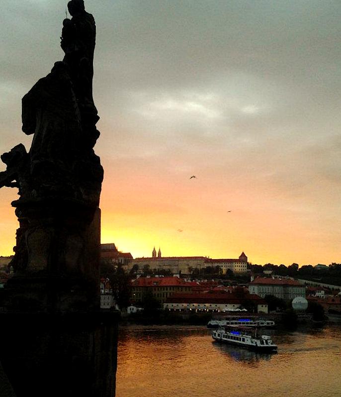 Al tramonto, poi, il Tempo si affaccia col suo volto più dolce, si fa arancio, viola, si fa cosmico. Dal Ponte Carlo, il passato sembra un concetto familiare e la Moldova lucente scorre anche lei senza sosta. La sua acqua taglia a metà un quadrilatero risultato dall’unione di quattro città anticamente distinte: Hradčany, il Castello, Malá Strana, il “piccolo quartiere”, Staré Město, la Città Vecchia, e Nové Město, Città Nuova.