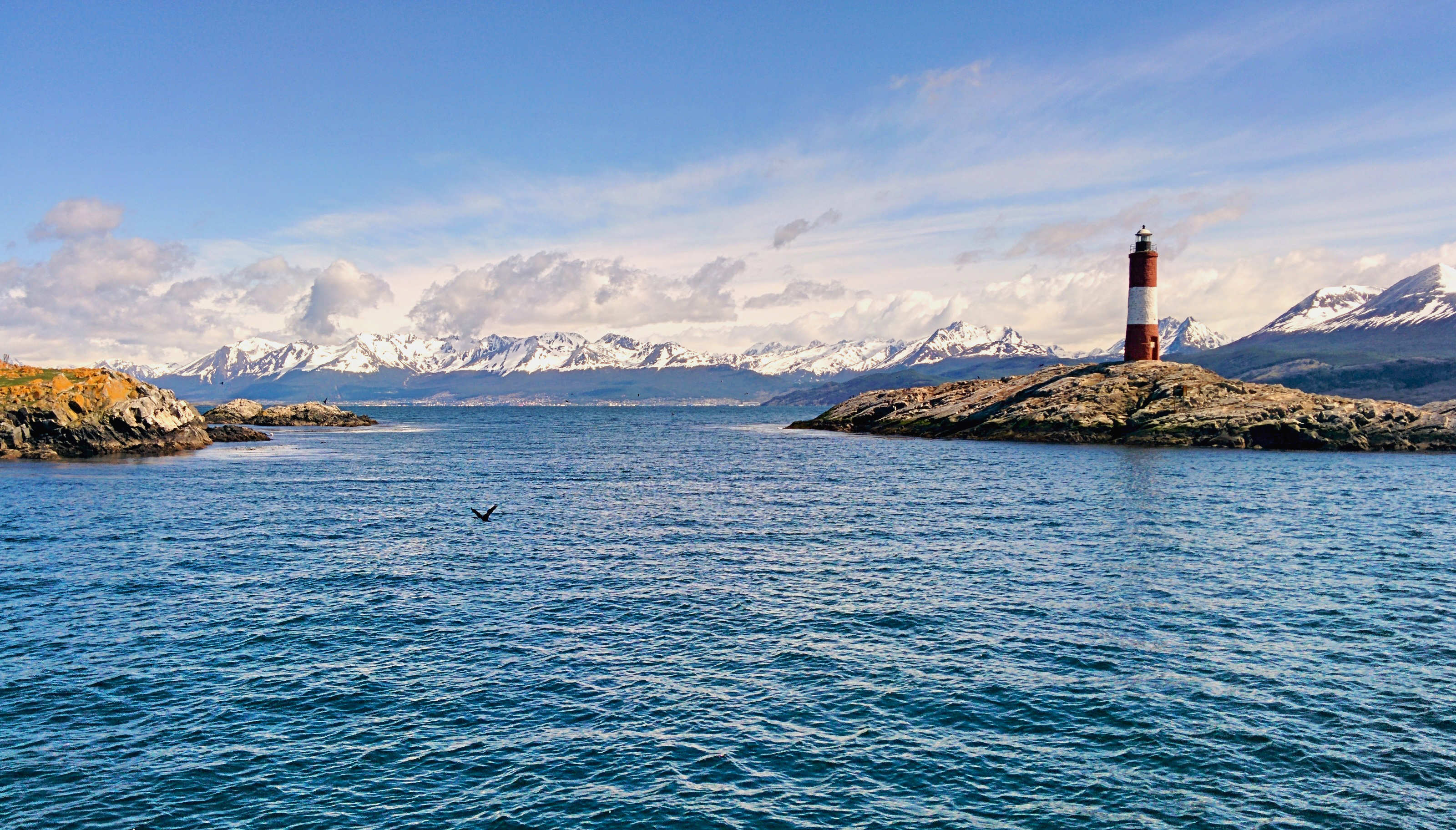 Nella scenografica cornice delle ultime propaggini delle Ande scorgo l’Isla de los Lobos (dei leoni marini), l’Isla de los Pájaros (dei cormorani) ed il faro Les Eclaireurs, el faro de la fin del mundo. Adesso sì che sono alla fine del mondo.